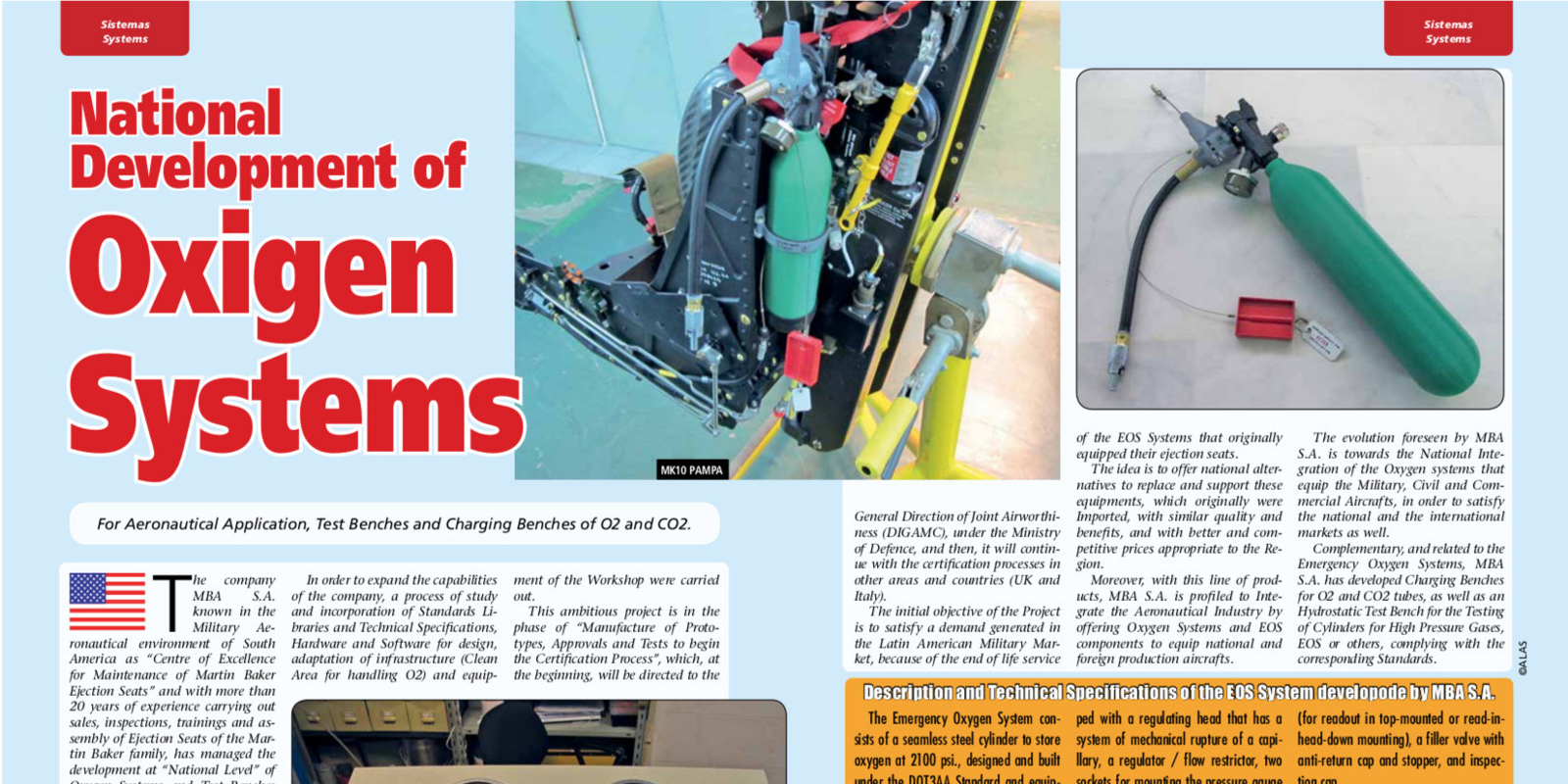 The company MBA S.A. - ARGENTINA known in the Military Aeronautical environment of South America as “Centre of Excellence for Maintenance of Martin Baker Ejection Seats” and with more than 20 years of experience carrying out sales, inspections, trainings and assembly of Ejection Seats of the MARTIN BAKER family, has managed the development at “National Level” of Oxygen Systems and Test Benches and Charging Benches of pressure gases for Aeronautical Application.